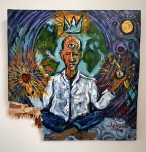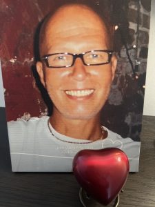 In the painting, he holds an illuminated watch in his left hand, symbolic of sacred time; and that the connection with him transcends linear time. In his right hand, he holds a glowing heart, identical to both the heart-shaped vessel that holds his ashes and a heart he once gave me in a powerful vision years ago. To me, it represents love without limits, endlessly given.