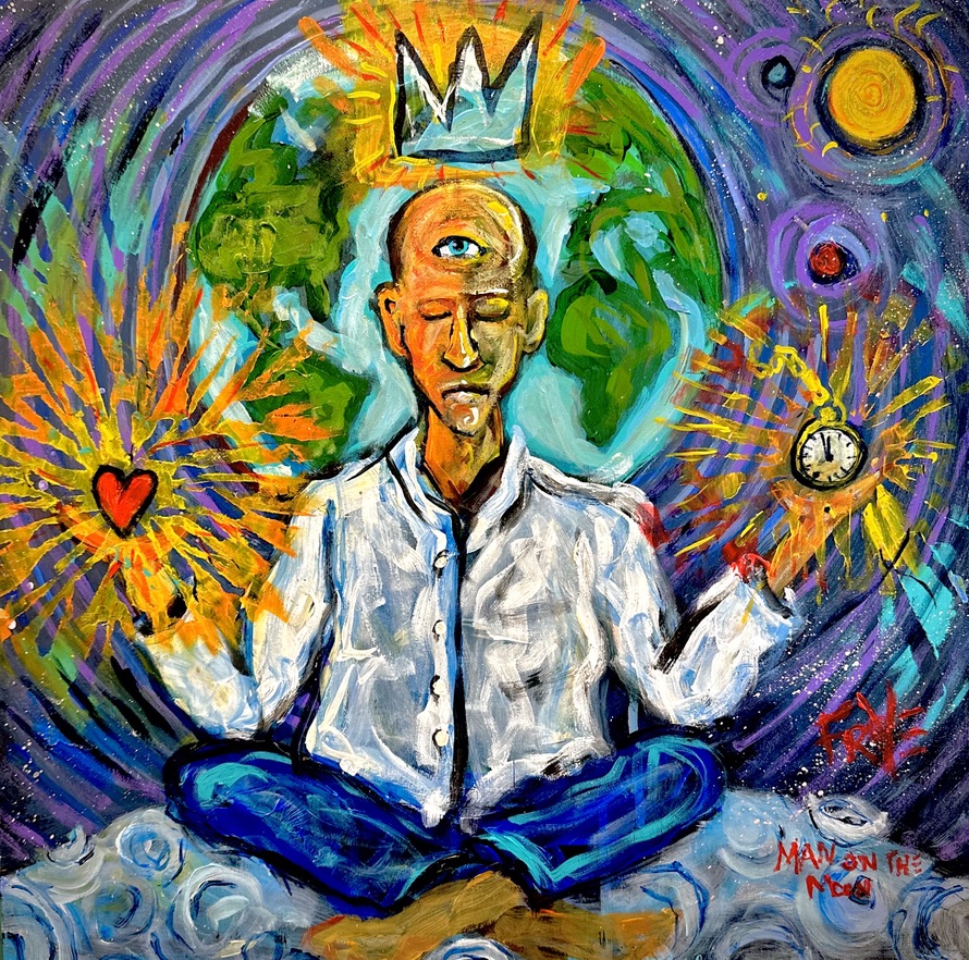 The painting depicts a man who looks undeniably like my father, seated on the moon and suspended in an ethereal space where the Earth, sun, and distant planets hover behind him. The setting alone felt significant, as I’ve been deeply connected to ancestral presence and other realms for some time. Seeing my father placed there felt intentional and timeless.